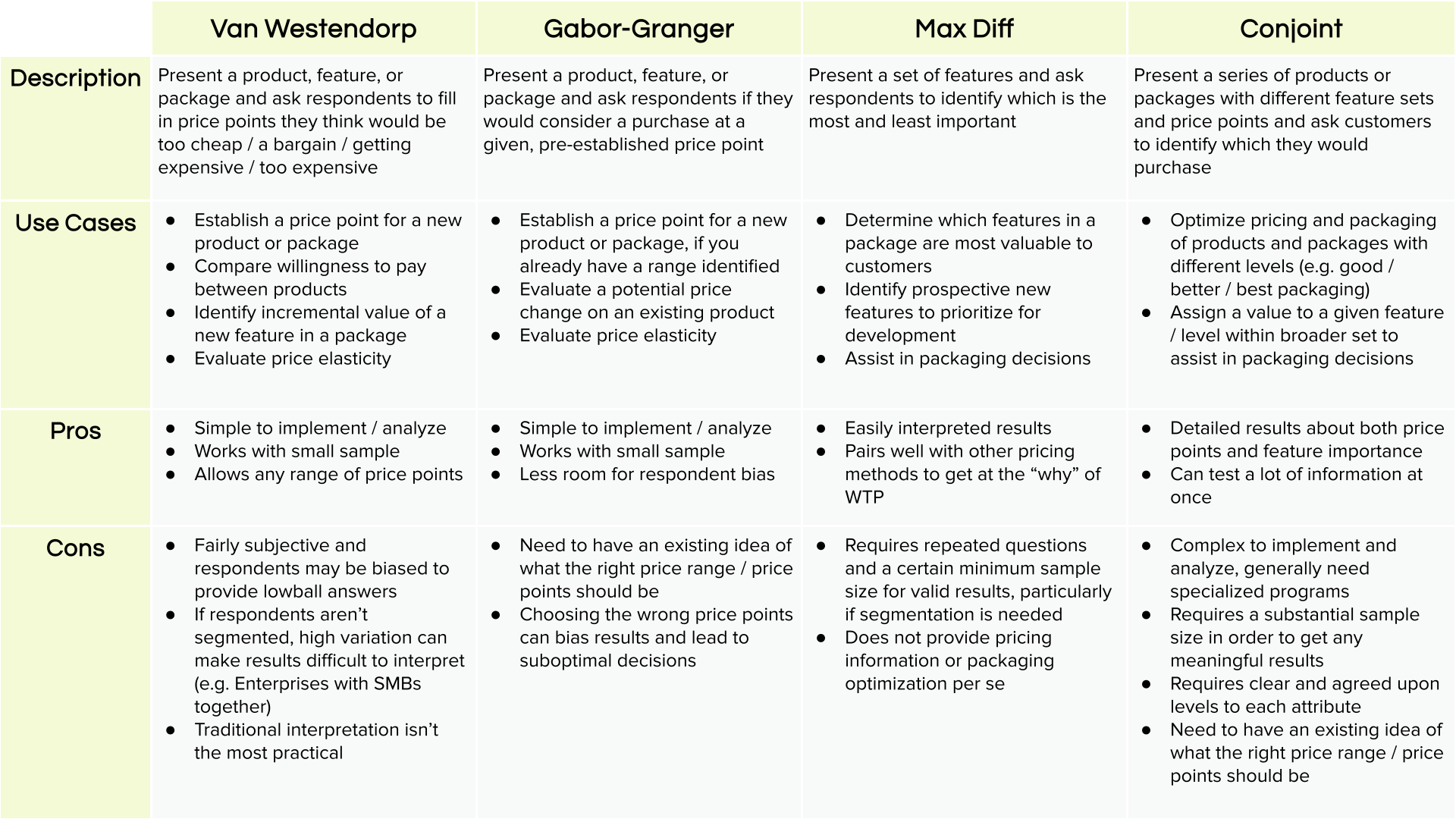 There are use cases that call for each of these methods, and which you choose will depend on the questions you’re trying to answer and, frankly, your budget. For example, Van Westendorp and Gabor-Granger surveys are far simpler and can be done with smaller sample sizes compared to Max-Diff and Conjoint Analysis. However, Conjoint Analysis is often considered the gold standard for quantitative pricing and packaging surveys and, when done right, the results are absolutely worth the investment.